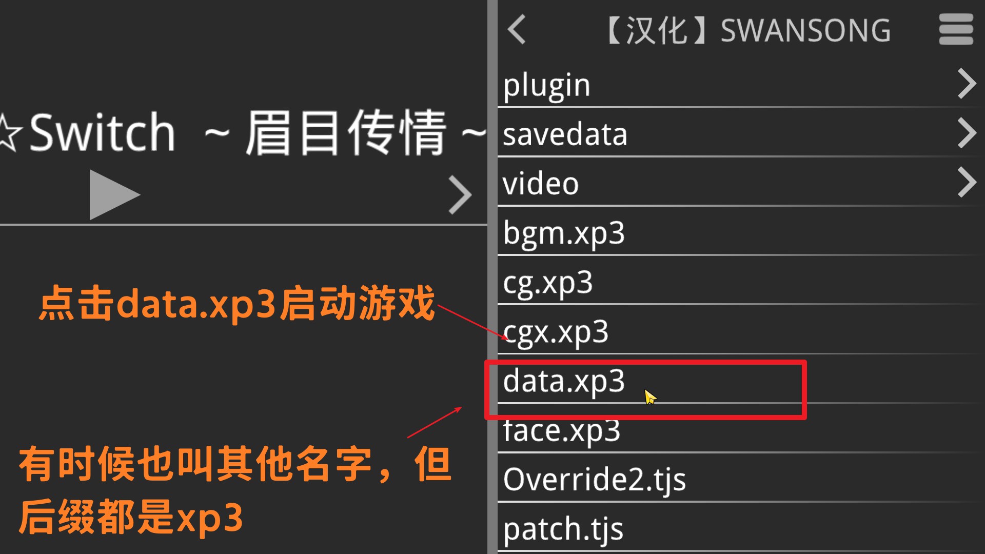 点击“data.xp3”启动游戏,有时候名字会写成“点击启动游戏”。意义一致不解释。